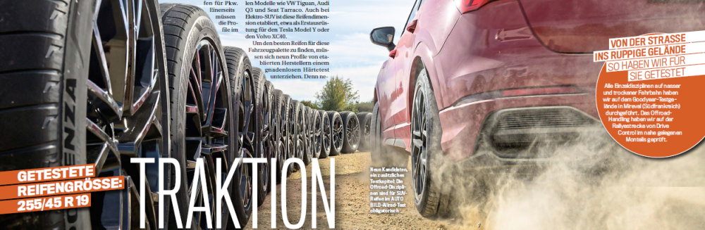 Auto Bild Allrad ha testato nove pneumatici estivi nella misura 255/45 R 19, una scelta comune per i SUV a trazione integrale come VW Tiguan, Audi Q3, Seat Tarraco, Tesla Model Y e Volvo XC40. I test su asciutto e bagnato sono stati effettuati presso il centro prove Goodyear di Mireval, nel sud della Francia, mentre la tenuta di strada in fuoristrada è stata valutata sul percorso rally di Drive Control, nella vicina Montéils. Oltre ai test standard su asciutto e bagnato, gli pneumatici sono stati valutati anche in prove di tenuta su ghiaia e di trazione su erba, ghiaia e sabbia: una scelta interessante, considerando le elevate prestazioni e la natura estiva di questi prodotti!