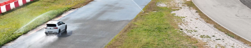 Per misurare la resistenza all'aquaplaning in linea retta, guido un lato del veicolo attraverso una canaletta d'acqua di profondità controllata, in genere intorno ai 7 mm, mentre il lato opposto rimane su asfalto asciutto. Entro a velocità fissa e poi accelero progressivamente. Definisco l'inizio dell'aquaplaning come il punto in cui la ruota che attraversa l'acqua supera una soglia di slittamento specificata rispetto alla ruota di riferimento sul lato asciutto. Di solito eseguo quattro prove per ogni set di pneumatici e calcolo la media dei risultati validi.